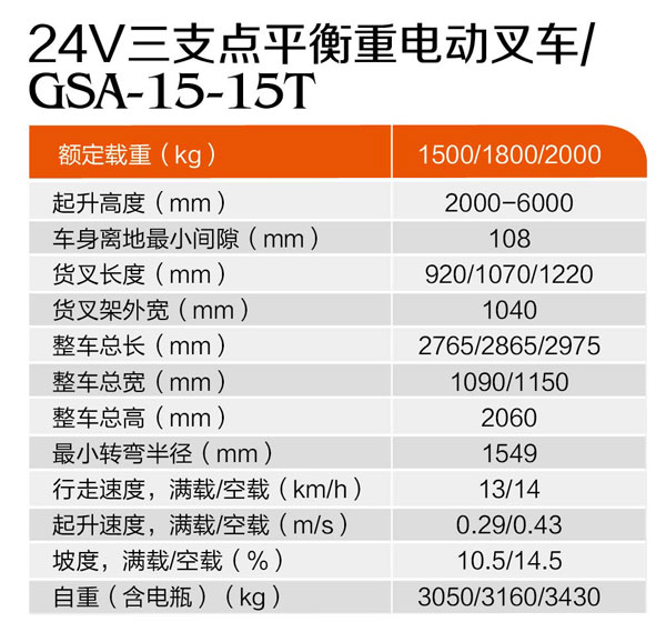 24V三支點(diǎn)平衡重電動(dòng)叉車GSA-15-15T